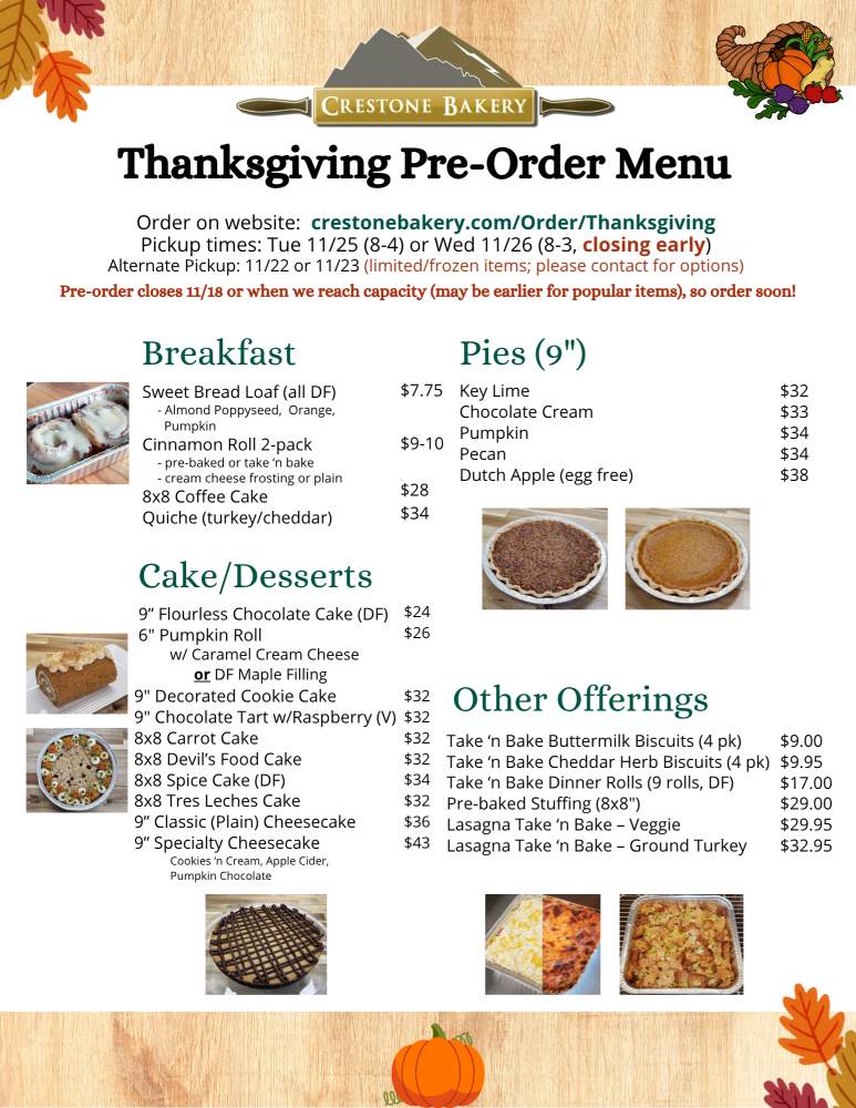 Thanksgiving Pre-Order open until 11/18! We will reach capacity for some items more quickly, so please order early to get exactly what you want. You can submit your request using our online form, specifying preferred pickup time Tue 11/25 8-4 or Wed 11/26 8-3. Click here for the menu.