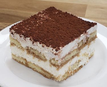 We make our own lady fingers in house, then soak them with espresso and Kahlua, layer with mascarpone, and dust with cocoa.